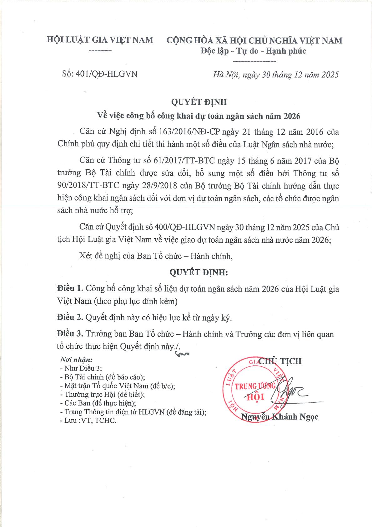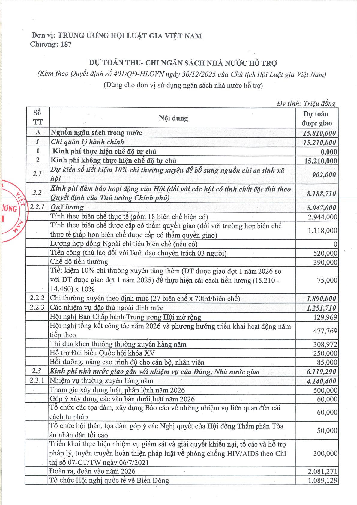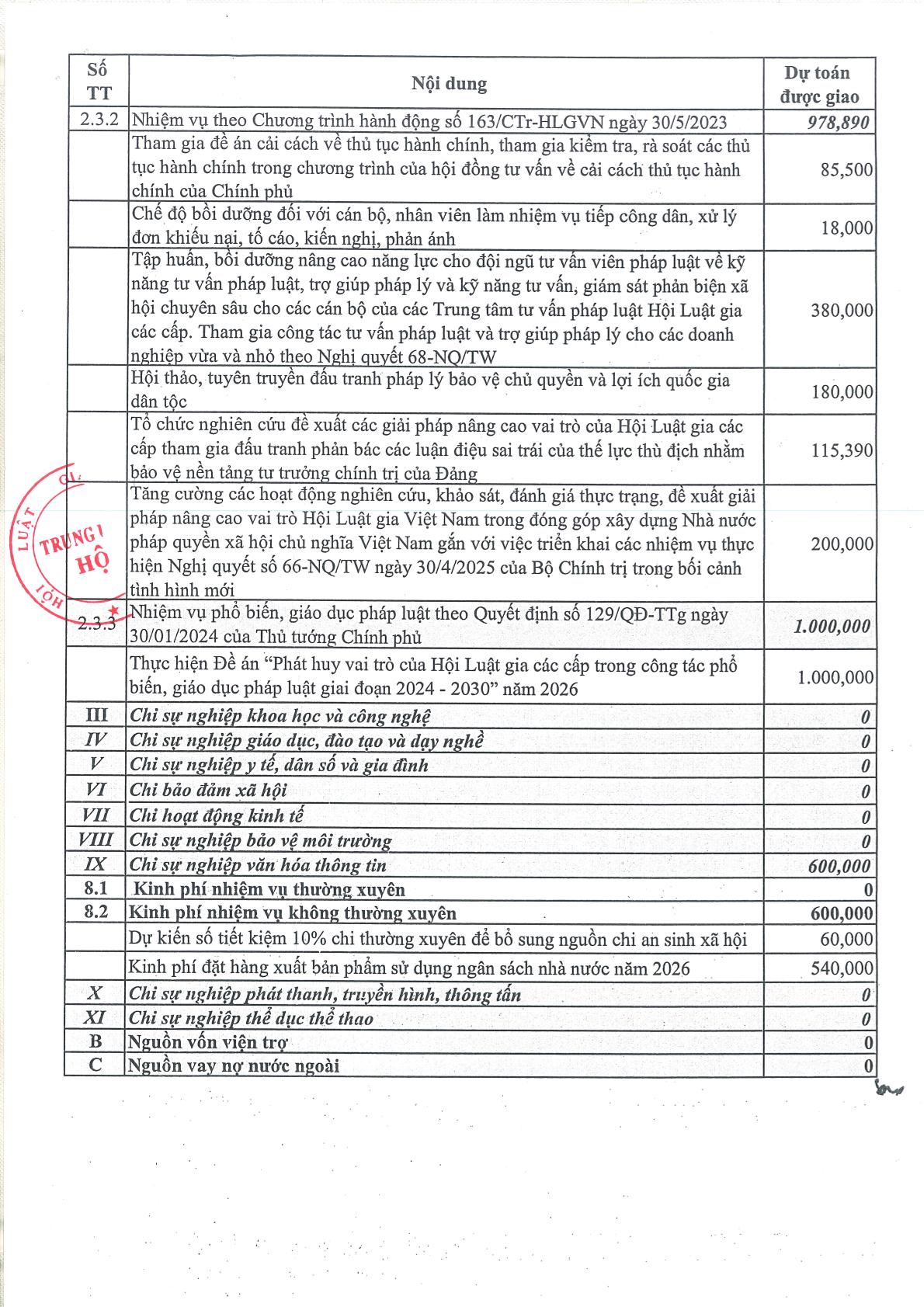 Công khai dự toán ngân sách nhà nước năm 2026 của Hội Luật gia Việt Nam (đợt 1)