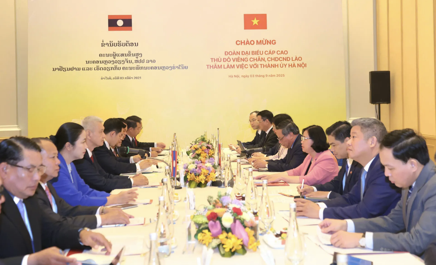 Bí thư Thành ủy Hà Nội Bùi Thị Minh Hoài đã tiếp và làm việc với Đoàn Đại biểu cấp cao Thủ đô Vientiane (Lào) dịp tháng 9/2025 (Ảnh: CTV).