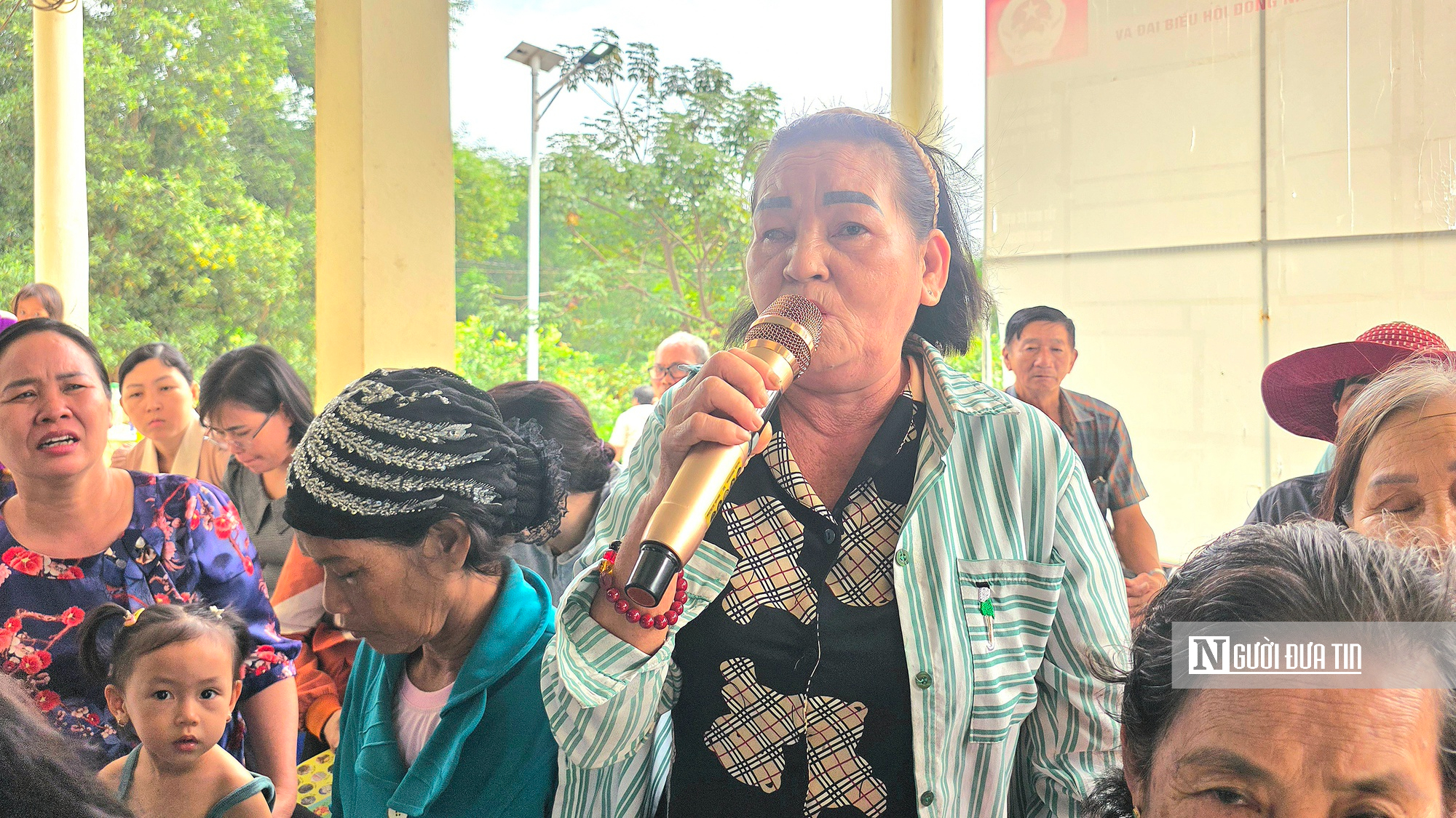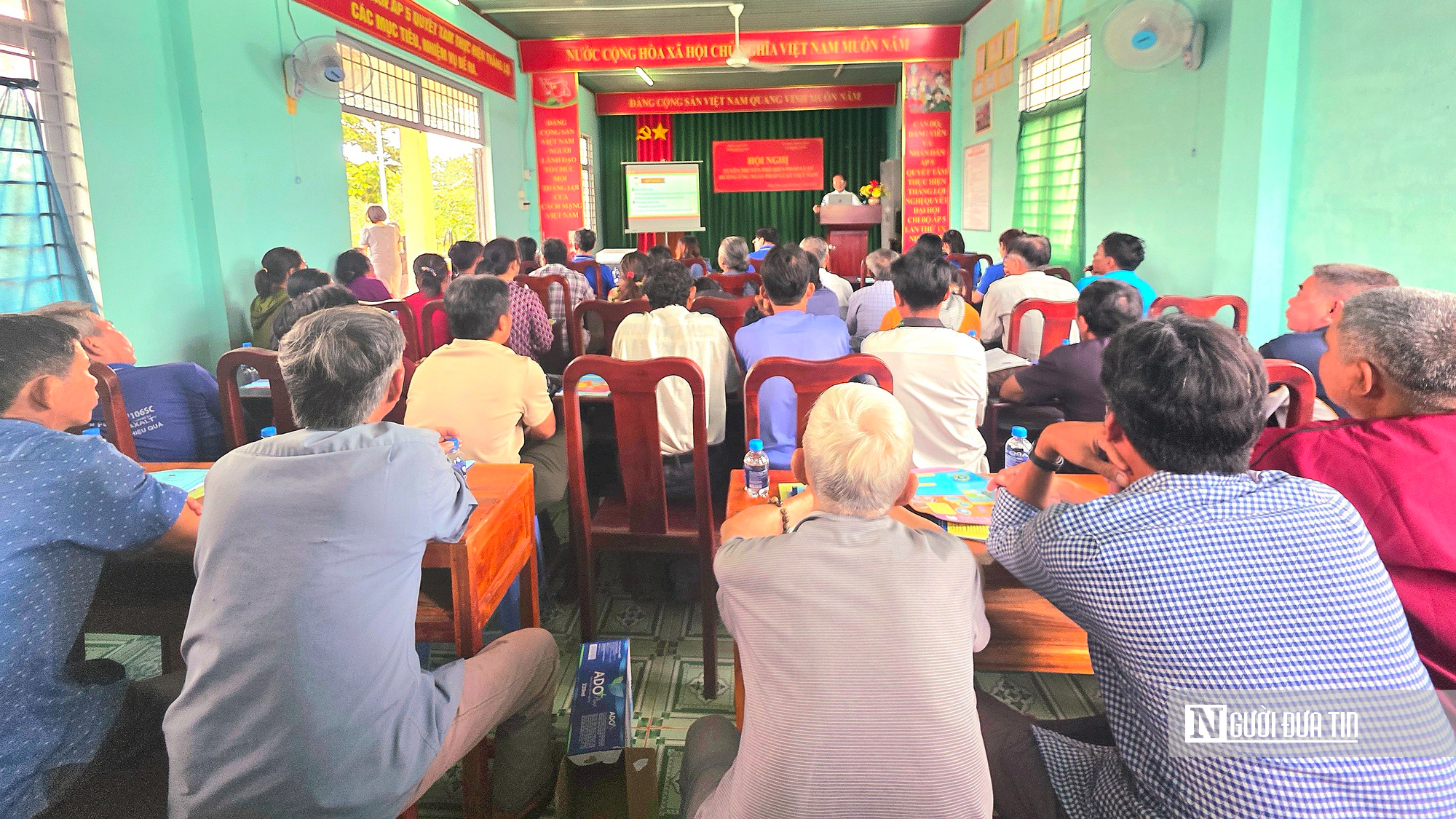 Người dân và cán bộ địa phương lắng nghe báo cáo viên trình bày các nội dung liên quan.