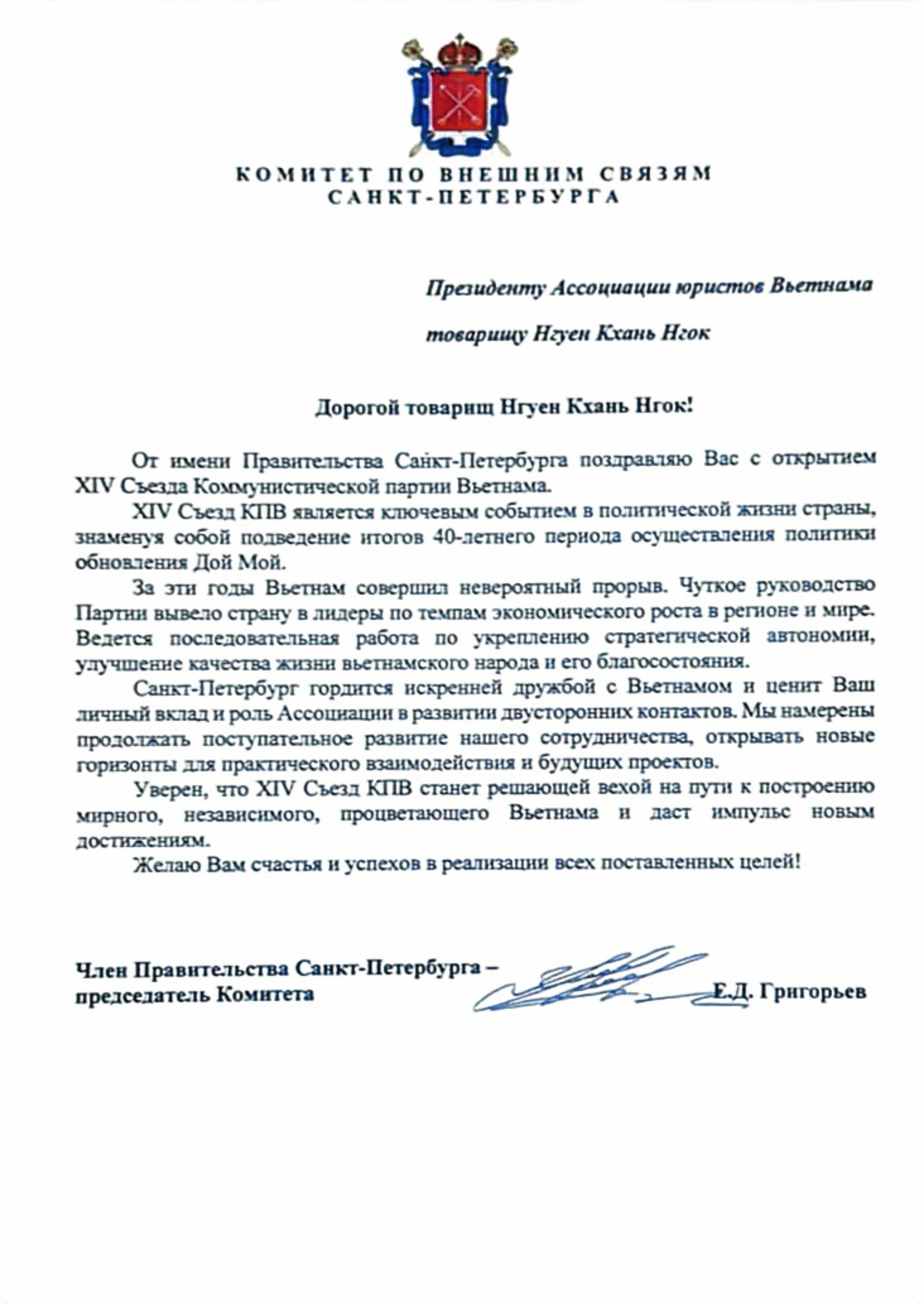 Thư chúc mừng của Ủy ban Đối ngoại thành phố Saint Petersburg (Liên bang Nga).