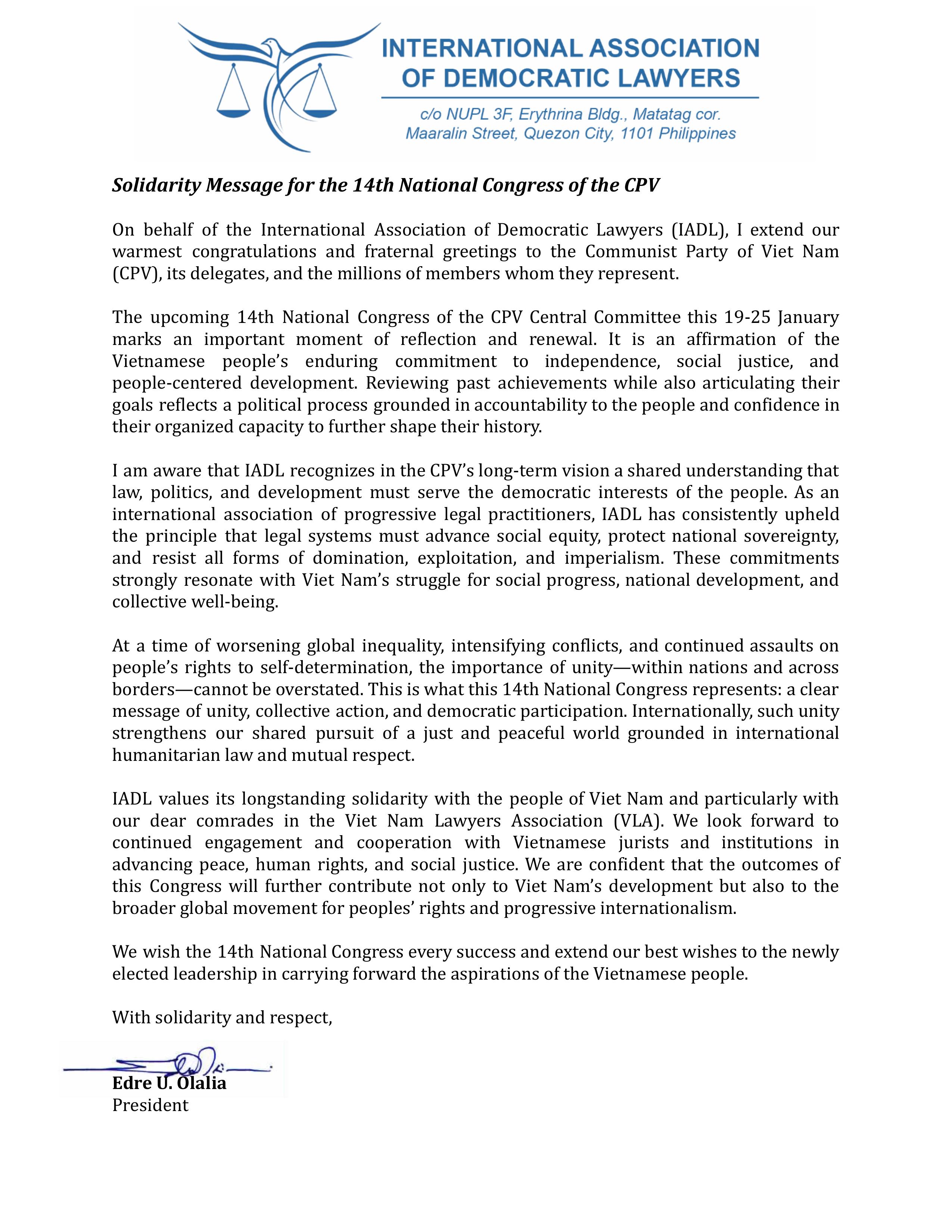 Thư chúc mừng của Hội Luật gia Dân chủ Quốc tế (IADL).